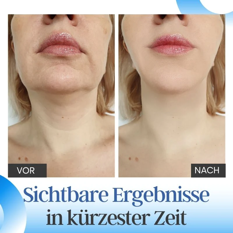 Diese elektrischen Ströme reparieren nicht nur beschädigte Haut, sondern regen auch die Kollagen- und Elastizitätsproduktion an. Das Ergebnis ist eine straffere, geschmeidige Haut, die das weiche Gewebe unter dem Kinn auffüllt und kaschiert.