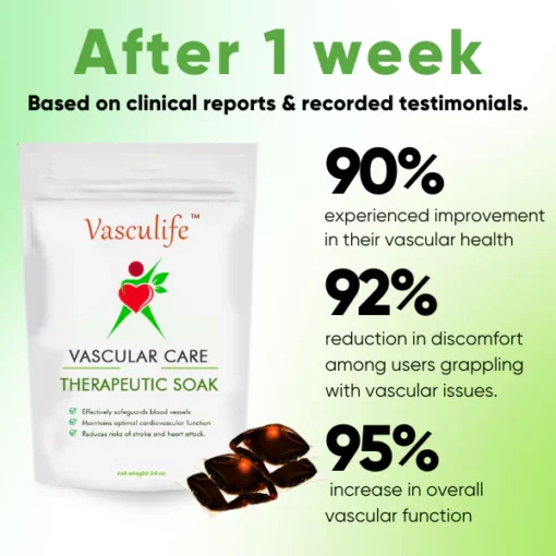 Vasculife™ Vascular Care Therapeutic Soak is a revolutionary product designed to support and enhance the health of your blood vessels. Your blood vessels play a crucial role in maintaining overall cardiovascular well-being, and any issues with them can lead to severe conditions such as stroke and heart attack. That’s why we’ve developed Vasculife™, to provide you with an effective and soothing solution for blood vessel care.
