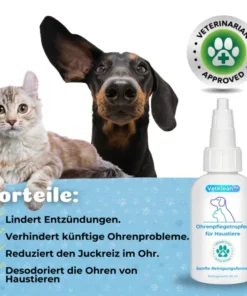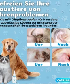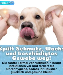Wir stellen vor: VetKlean™ Ohrenpflegetropfen für Haustiere: die unverzichtbare Lösung zur Erhaltung der Ohrengesundheit Ihres Haustieres. VetKlean™ wurde mit Sorgfalt und Fachwissen formuliert und reinigt und schützt sanft die Ohren Ihres pelzigen Freundes, sorgt für optimale Hygiene und beugt Infektionen vor. Vertrauen Sie VetKlean™ für glückliche, gesunde Ohren, die Ihr Haustier verdient!