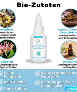 VetKlean™ Ohrenpflegetropfen für Haustiere bestehen aus sorgfältig ausgewählten natürlichen Inhaltsstoffen, die das Wohlbefinden Ihres Hundes in den Vordergrund stellen, indem sie sicherstellen, dass er frei von Reizungen oder Beschwerden ist. Wir wählen jede Komponente sorgfältig unter Berücksichtigung der Gesundheit Ihres Hundes aus und bekräftigen unser Engagement für seine äußerste Sorgfalt und Sicherheit.
