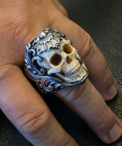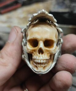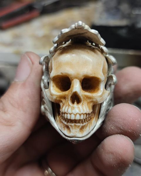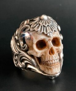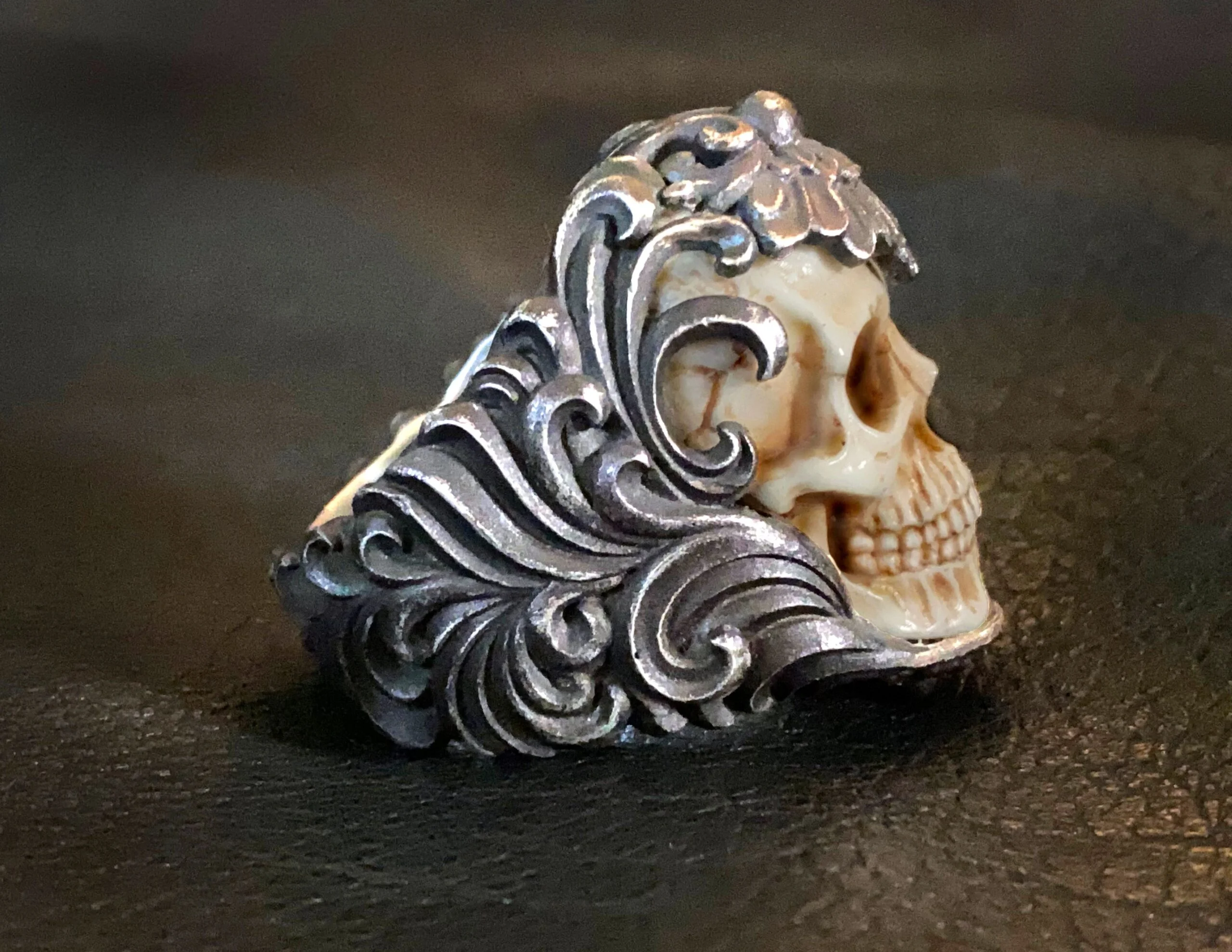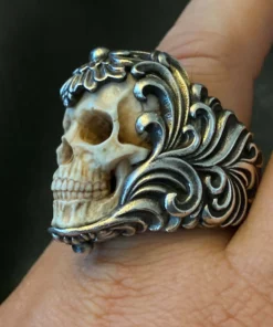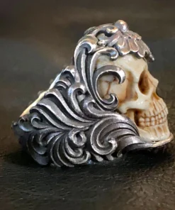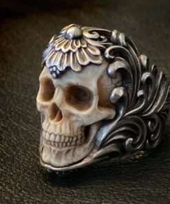 🔱The super realistic skull carved from top quality deer antler of high density embedded in an intricate floral ornament silver ring band makes this piece an absolute eye-catcher.