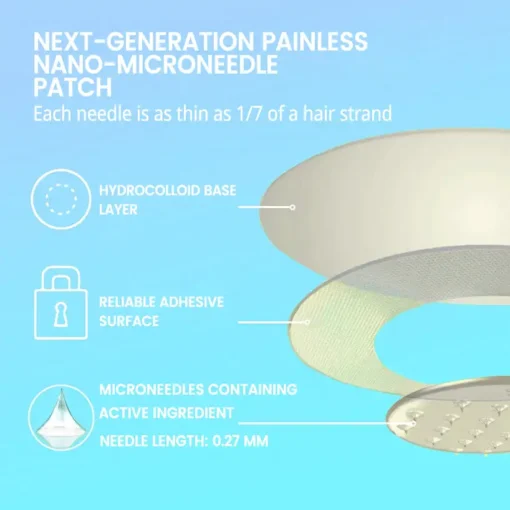 Each needle is 0.27 mm long, only 1/7th the thickness of a hair , and is made from soluble medication . These microneedles are precisely engineered using advanced manufacturing techniques to ensure a smooth and painless experience while effectively delivering active ingredients directly into the skin.