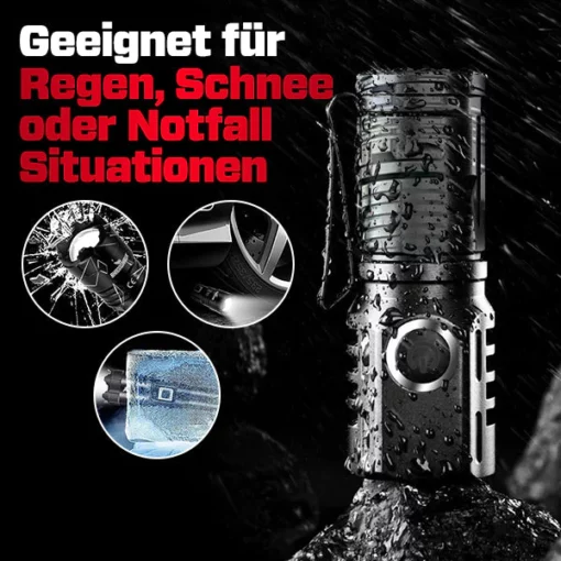 VoltGuard Elite 2 in 1 Military Flashlight is constructed with aerospace grade aluminum alloy to withstand rough handling. With an IP67 waterproof rating, this powerful flashlight can endure a 3 meter drop and temporary submersion in water. Incredibly, it is also capable of withstanding freezing temperatures and being run over by a truck – all while still functioning! Whether you’re in the rain, snow, or an emergency situation, VoltGuard is your reliable companion.