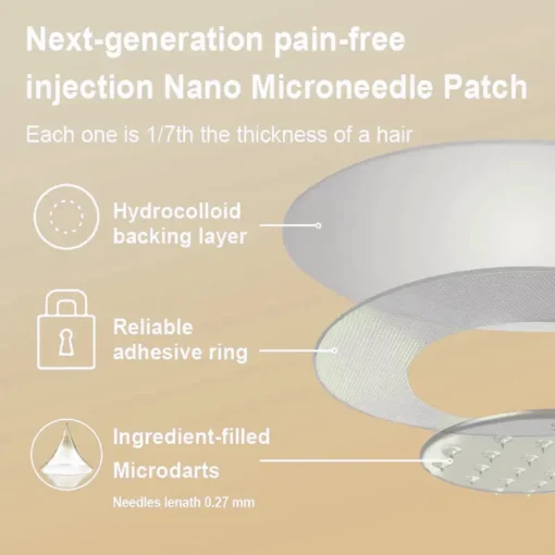 The Nano Microneedle Patch contains FDA-Tirzepatide in each patch. It works by mimicking the action of Glucagon-like Peptide-1 (Tirzepatide). promoting insulin secretion. inhibiting glucagon secretion. and delaying gastric emptying. which helps control blood sugar levels and aids in weight loss.
