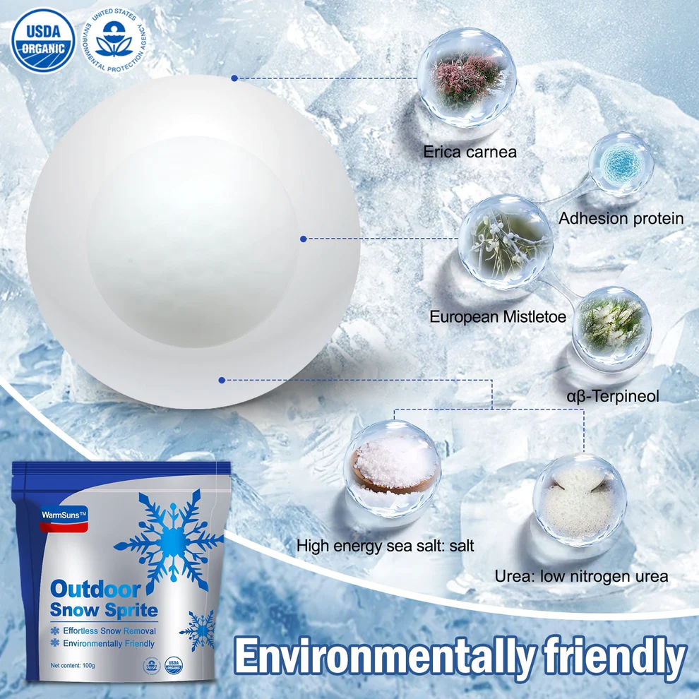 WarmSuns™ Outdoor Snow Sprite is made using pure natural plant extracts, sea salt, and urea using microwave-assisted extraction. This technology not only has the function of preserving the performance of ingredients but also promotes the release of components using microwave energy. It has obtained EPA certification and USDA organic certification, making it environmentally friendly.