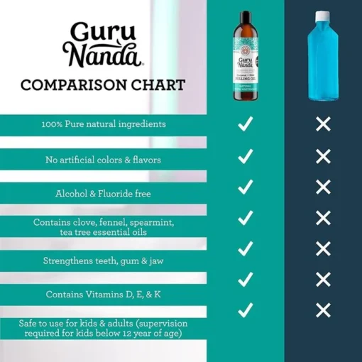To start oil pulling take one tablespoon of the GuruNanda’s oil andswish it around your mouth for about 2-5 min (you can do up to 10min) make sure to move it between your teeth and around your gums.After swishing, spit the oil out into a trash can or tissue, as it can clogsinks or toilets, Rinse your mouth thoroughly with water and follow upwith regular brushing and flossing.
