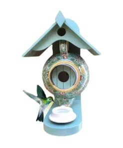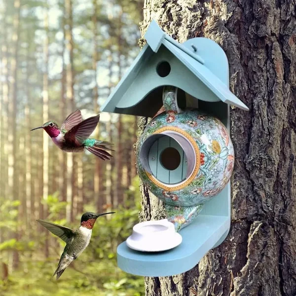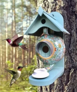 🌸This Beautifully Handmade Medium Teapot Hummingbird House with the Lid as a Feeder set on a Green Frame.