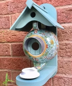 It comes Fitted on a Green Wood Frame including a hole for the spout in the wood to make the Birdhouse look naturally part of the frame with a hole for the teapot lid to fit to be used as a Feeder and a fitted Wood Front Panel with a bird hole.