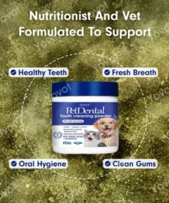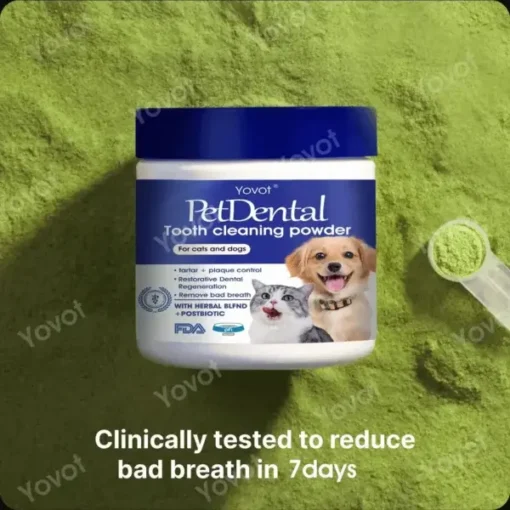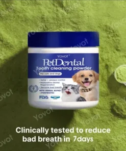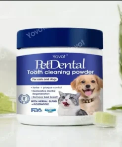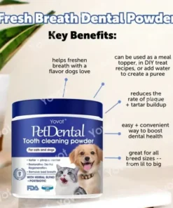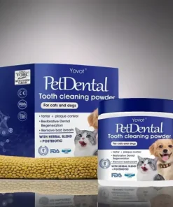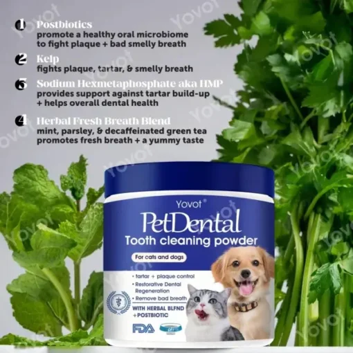 Yovot® Pet Dental Powder eliminates 99.99% of bacteria, resolves bad breath, removes plaque and tartar, treats gingivitis, and supports your pet’s dental health. This powder is formulated with natural ingredients to provide a gentle yet effective way to clean your pet’s teeth and promote gum health.