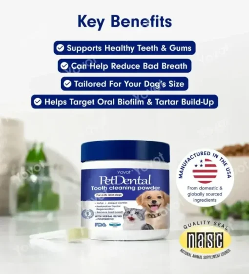 Give your pet the gift of optimal oral health with Yovot® Pet Dental Powder. Formulated with natural ingredients and probiotics, this powder helps maintain healthy teeth and gums while freshening breath and preventing tartar build-up. A must-have for every pet owner!