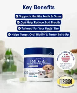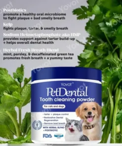 Yovot® Pet Dental Powder eliminates 99.99% of bacteria, resolves bad breath, removes plaque and tartar, treats gingivitis, and supports your pet’s dental health. This powder is formulated with natural ingredients to provide a gentle yet effective way to clean your pet’s teeth and promote gum health.
