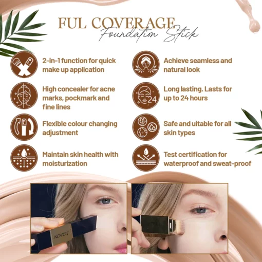 - 2-in-1 Solution: Zakdavi™️ Dual Action Full Coverage Foundation Stick combines wipe and brush application for a blemish-free complexion.