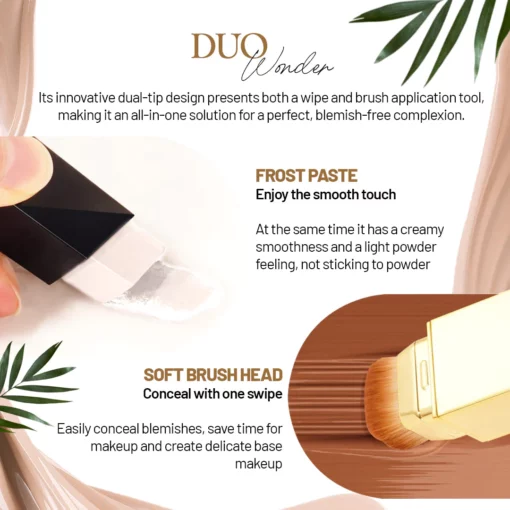 Discover the effortless path to flawless skin with Zakdavi™️ Dual Action Full Coverage Foundation Stick! Its matte formula conceals dark circles, wrinkles, acne marks, and more, while the dual-tip design ensures easy application. With microencapsulated pigments, it adjusts to your skin tone perfectly, offering waterproof protection and controlling oiliness. Embrace your flawless beauty today!!