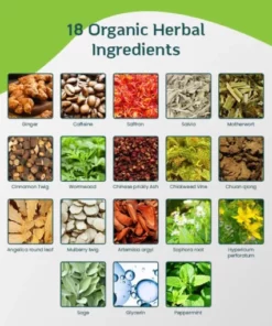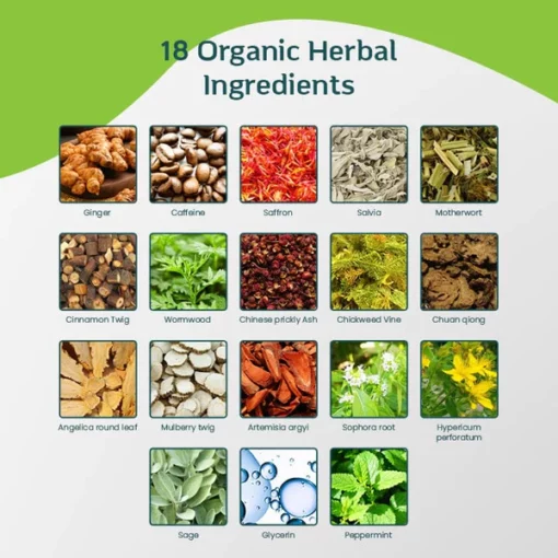 - Ingredients: Ginger, Caffeine, Saffron, Salvia, Motherwort, Cinnamon Twig, Wormwood, Chinese prickly Ash, Chickweed Vine, Chuan qiong, Angelica round leaf, Mulberry twig, Artemisia argyi, Sophora root, Hypericum perforatum, Sage, Glycerin, Peppermint extract
